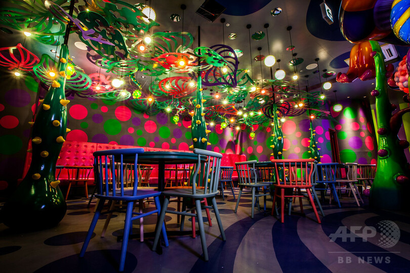 東京都最大級面積のカフェ「KAWAII MONSTER CAFE」は、店内に入るとすぐにケーキ型メリーゴーランドが出迎えてくれる。座席は、カラフルなキノコや植物達の「MUSHROOM DISCO」、動物と哺乳瓶が妖しく光る「MILK STAND」、 巨大クラゲのバー「BAR Experiment」、甘くてとろける「Mel-Tea ROOM」の4つのゾーンから選ぶことが可能で、どのゾーンでも増田セバスチャンのアートを体感できる。