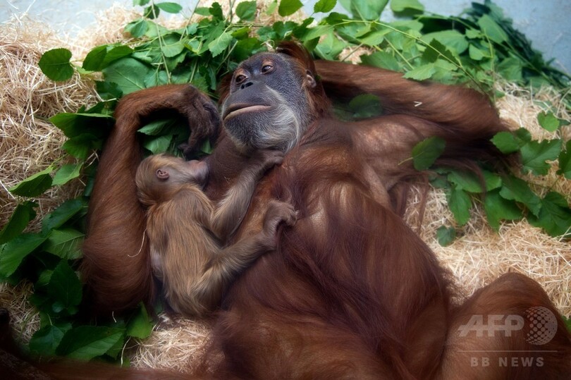 生まれたてのオランウータンの赤ちゃん、ママに寄り添いすやすや 独