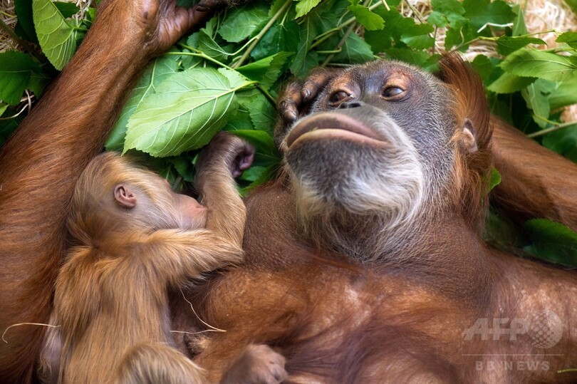 生まれたてのオランウータンの赤ちゃん、ママに寄り添いすやすや 独