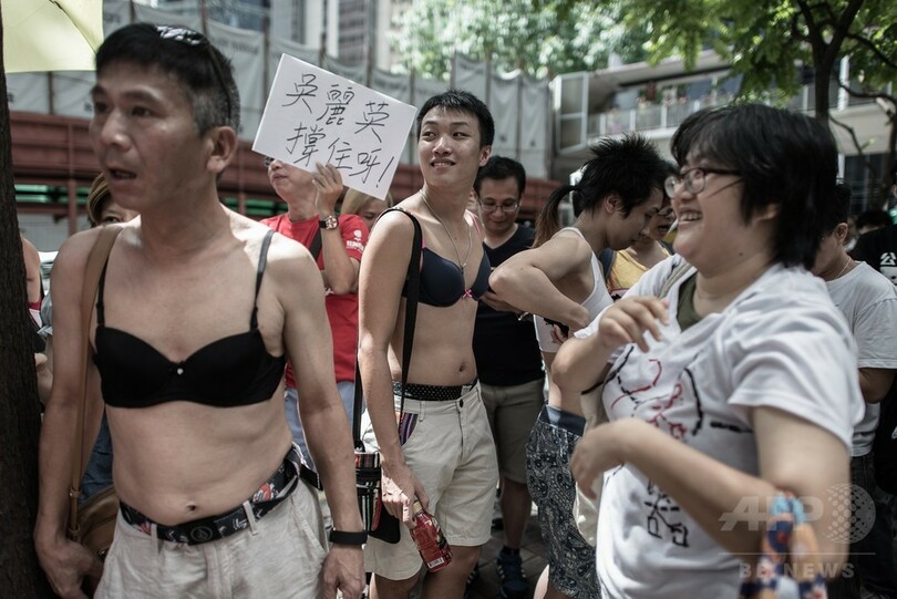 香港でブラジャーデモ、「胸で警官に暴行」実刑判決に抗議