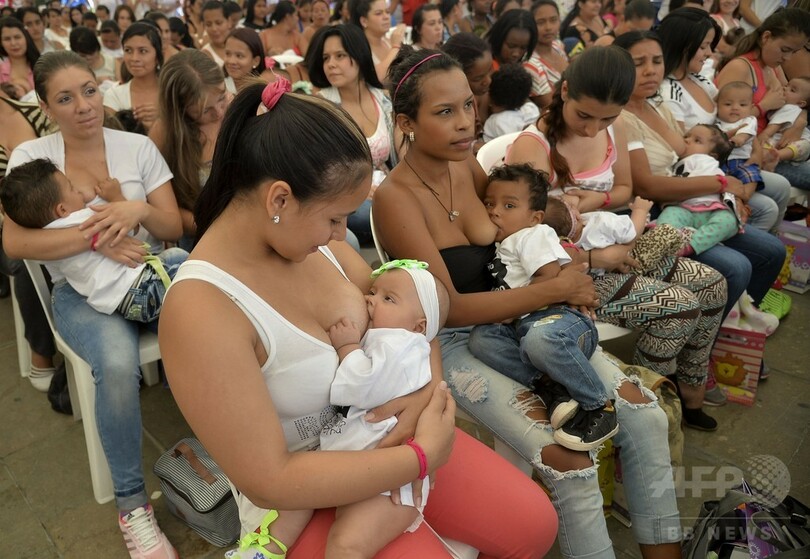 フィリピンでは毎年8月を母乳育児啓発月間とし、「母乳育児国家」を目指している。コロンビア・アンティオキア(Antioquia)州の州都メデジン(Medellin)では、母乳による乳児の健康促進を奨励する大規模なイベントが行われ、300人以上の母親が子どもを連れて参加した。中国では授乳育児と仕事の両立への支援を訴える取り組みとして、約20人の母親たちが地下鉄の車内で授乳を行った。(c)AFP