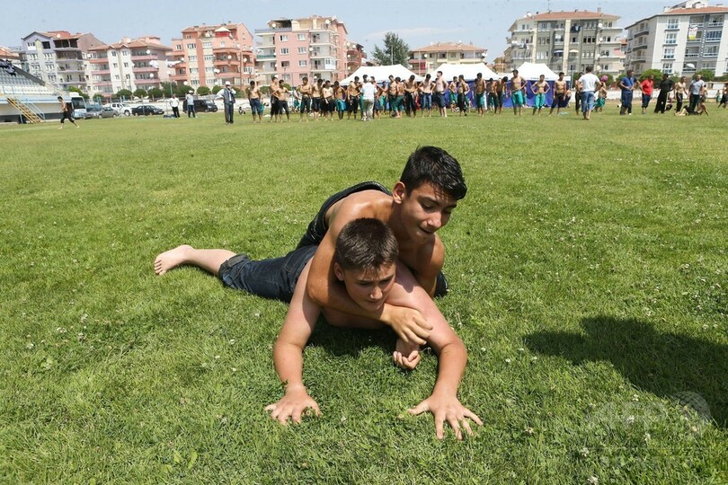 【8月5日 AFP】トルコのアンカラ(Ankara)で1日、「オイル・レスリング(油相撲)」の第7回大会が開かれた。「オイル・レスリング」の競技者は、全身にオリーブ油を塗った「つるつる状態」で試合に臨む。(c)AFP