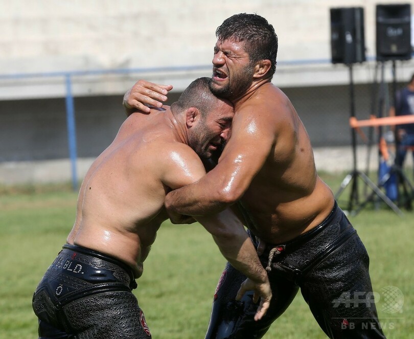 【8月5日 AFP】トルコのアンカラ(Ankara)で1日、「オイル・レスリング(油相撲)」の第7回大会が開かれた。「オイル・レスリング」の競技者は、全身にオリーブ油を塗った「つるつる状態」で試合に臨む。(c)AFP