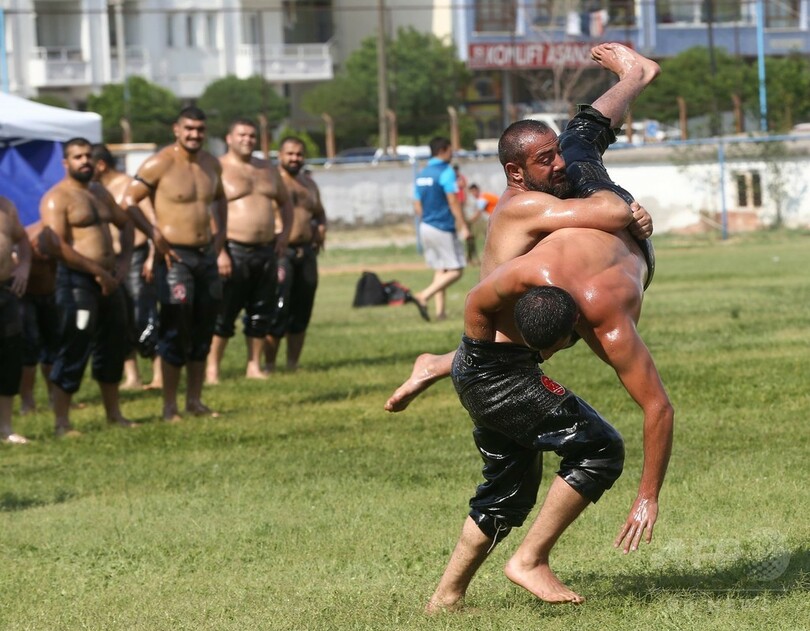【8月5日 AFP】トルコのアンカラ(Ankara)で1日、「オイル・レスリング(油相撲)」の第7回大会が開かれた。「オイル・レスリング」の競技者は、全身にオリーブ油を塗った「つるつる状態」で試合に臨む。(c)AFP