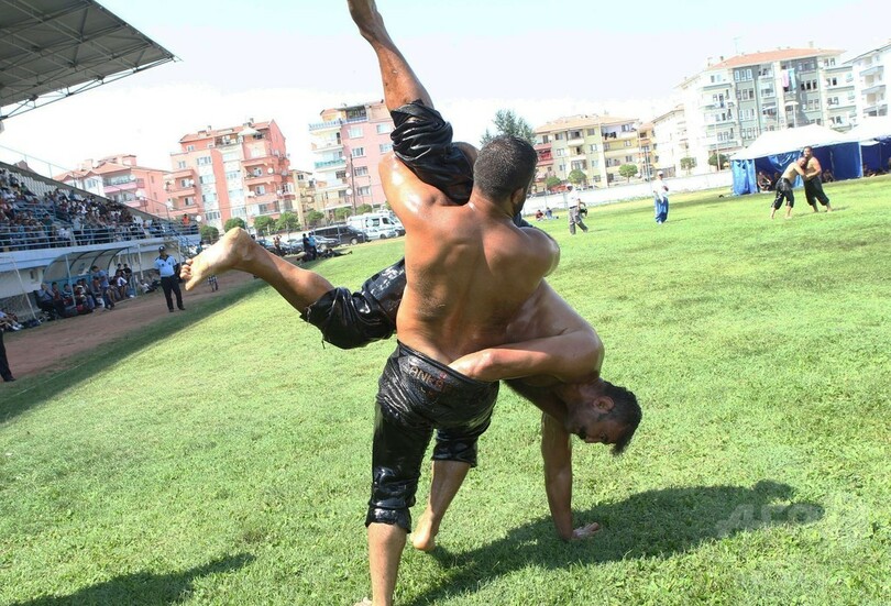 【8月5日 AFP】トルコのアンカラ(Ankara)で1日、「オイル・レスリング(油相撲)」の第7回大会が開かれた。「オイル・レスリング」の競技者は、全身にオリーブ油を塗った「つるつる状態」で試合に臨む。(c)AFP