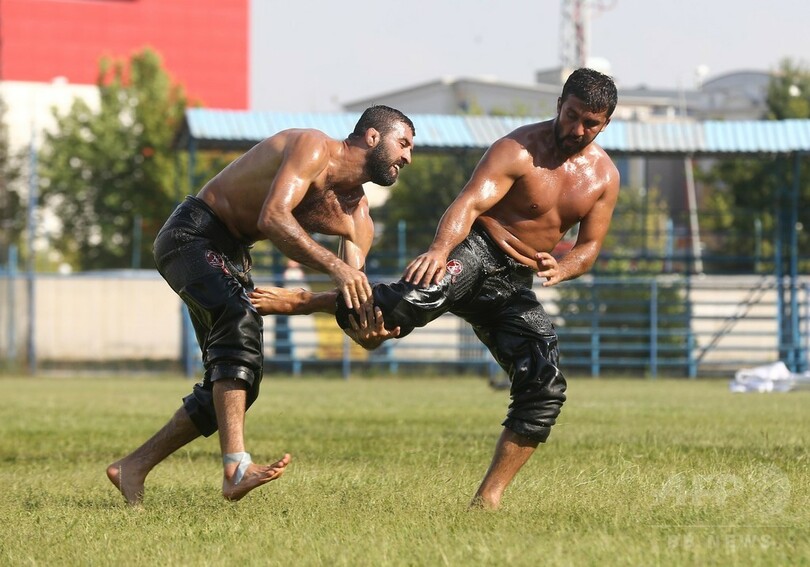 【8月5日 AFP】トルコのアンカラ(Ankara)で1日、「オイル・レスリング(油相撲)」の第7回大会が開かれた。「オイル・レスリング」の競技者は、全身にオリーブ油を塗った「つるつる状態」で試合に臨む。(c)AFP