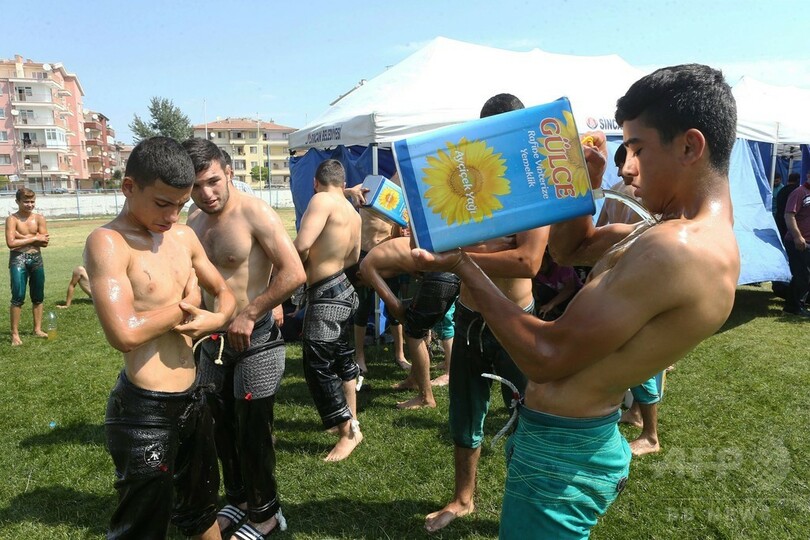 【8月5日 AFP】トルコのアンカラ(Ankara)で1日、「オイル・レスリング(油相撲)」の第7回大会が開かれた。「オイル・レスリング」の競技者は、全身にオリーブ油を塗った「つるつる状態」で試合に臨む。(c)AFP