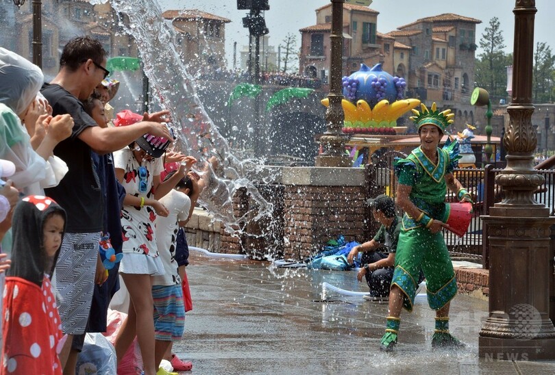 【8月5日 AFP】千葉県浦安市の東京ディズニーシー(Tokyo DisneySea)では、夏期の特別イベントとして、ミッキーマウスやキャストたちが来園したゲストにバケツやホースで水をかけ、ひと時の涼を提供している。東京では4日の気温が35度まで上昇。政府発表によると、2日までの1週間に1万人以上が熱中症などで病院に運ばれ、25人が死亡している。(c)AFP