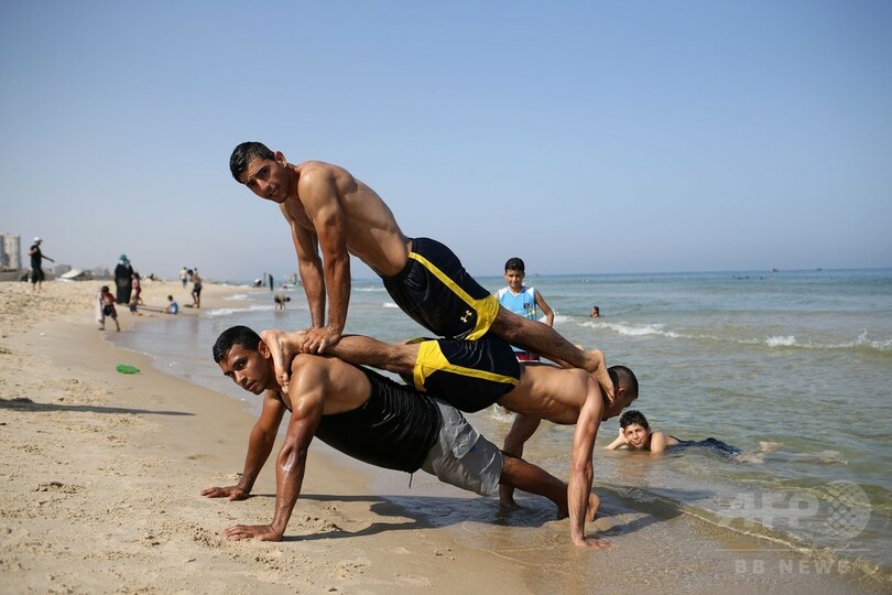 【8月10日 AFP】パレスチナ自治区ガザ地区(Gaza Strip)ガザ市(Gaza City)の砂浜で7日、パレスチナ人の「ストリートワークアウト」のグループが練習する姿が見られた。町中にある柱や道具などを使って体を鍛えるストリートワークアウトは世界大会が開催されるなど人気拡大中だが、ガザでは目新しい。(c)AFP