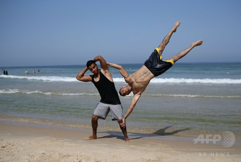 【8月10日 AFP】パレスチナ自治区ガザ地区(Gaza Strip)ガザ市(Gaza City)の砂浜で7日、パレスチナ人の「ストリートワークアウト」のグループが練習する姿が見られた。町中にある柱や道具などを使って体を鍛えるストリートワークアウトは世界大会が開催されるなど人気拡大中だが、ガザでは目新しい。(c)AFP
