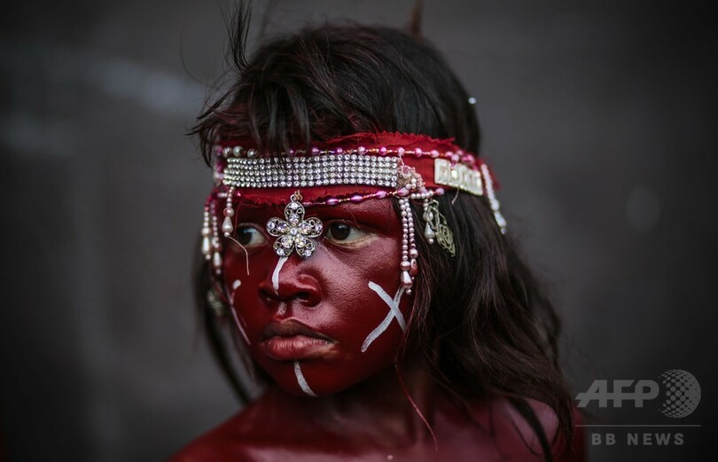 祭りには、体や顔にペイントを施し、伝統衣装を身に着けた少年や少女、男女が参加した。(c)AFP