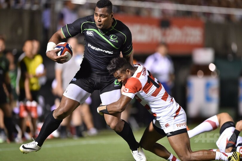 日本はその後、認定トライを奪ったものの、世界選抜のナイヤラボロは終盤に2つのトライを記録し、ハットトリックを達成した。(c)AFP