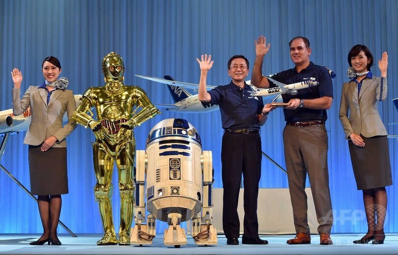 【8月19日 AFP】全日空(All Nippon Airways、ANA)は18日、人気SF映画シリーズ「スター・ウォーズ(Star Wars)」の特別塗装機として、ロボットの「R2-D2」をペイントしたボーイング787-9型機と、新キャラクターのロボット「BB-8」をペイントしたボーイング777-300ER型機の縮小模型を発表した。10月からボーイング787-9型機を国際線で、来年からボーイング777-300ER型機を北米向けの便で就航開始する予定だ。(c)AFP