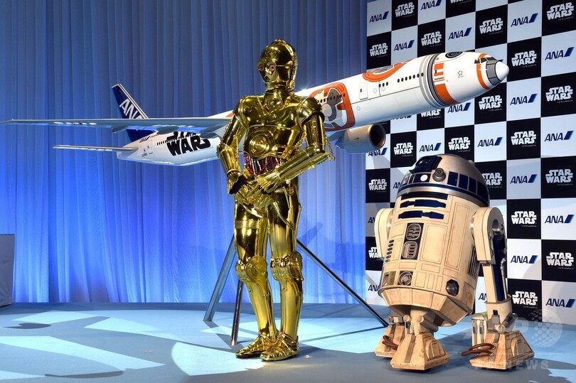 【8月19日 AFP】全日空(All Nippon Airways、ANA)は18日、人気SF映画シリーズ「スター・ウォーズ(Star Wars)」の特別塗装機として、ロボットの「R2-D2」をペイントしたボーイング787-9型機と、新キャラクターのロボット「BB-8」をペイントしたボーイング777-300ER型機の縮小模型を発表した。10月からボーイング787-9型機を国際線で、来年からボーイング777-300ER型機を北米向けの便で就航開始する予定だ。(c)AFP