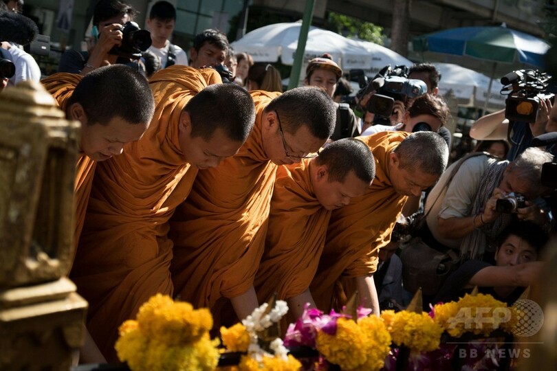 【8月19日 AFP】タイの首都バンコク(Bangkok)の繁華街で爆弾が爆発し20人が死亡した事件で、現場となったヒンズー教の祠(ほこら)「エラワン廟(びょう)」(Erawan Shrine)が19日午前、再開し、十数人の僧侶が訪れて祈りをささげた。