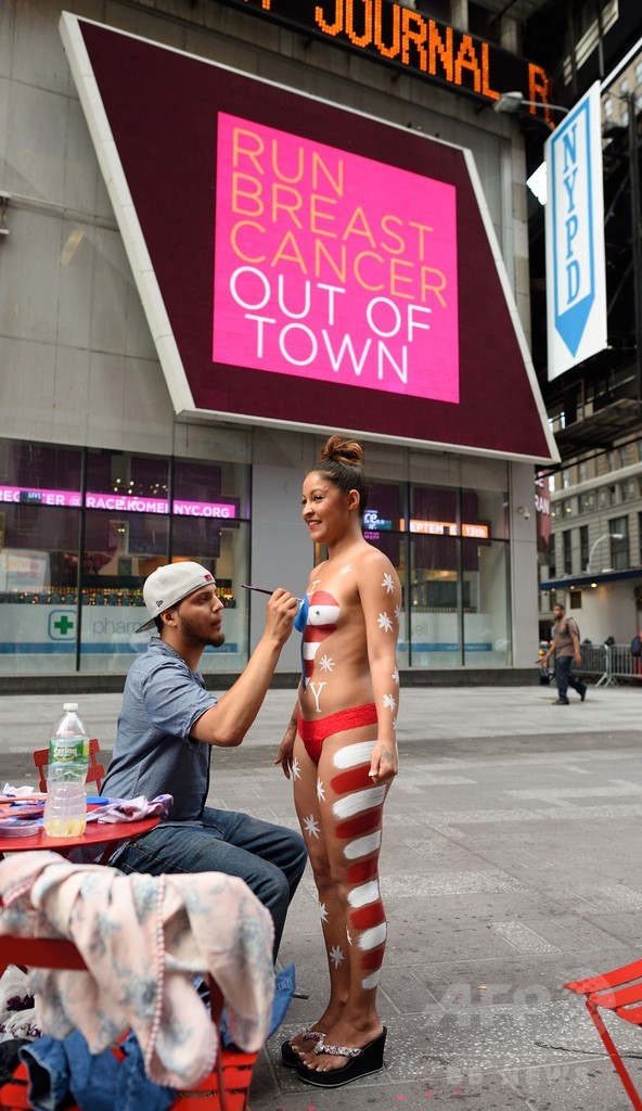 米ニューヨークのタイムズ・スクエアで観光客と写真を撮るため、ボディーペインティングを施している女性(2015年8月19日撮影)。(c)AFP/DON EMMERT