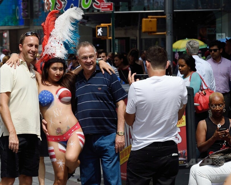 【8月20日 AFP】米ニューヨークのタイムズ・スクエア(Times Square)で18日、ボディーペインティングを施して観光客と写真を撮る女性らの姿が見られた。ビル・デブラシオ(Bill de Blasio)市長は、これらの女性を押しつけがましい物乞いと非難、観光客からお金を集める行為は取り締まるべきだとコメントした。(c)AFP