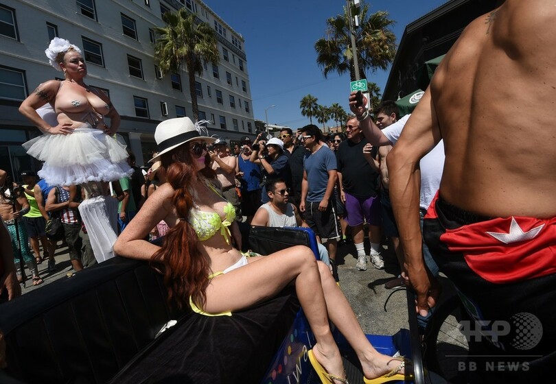 米カリフォルニア州ベニス・ビーチで、女性が公共の場で上半身裸になる権利を求める「ゴートップレスデー」のパレードに参加する人々(2015年8月23日撮影)。(c)AFP/MARK RALSTON