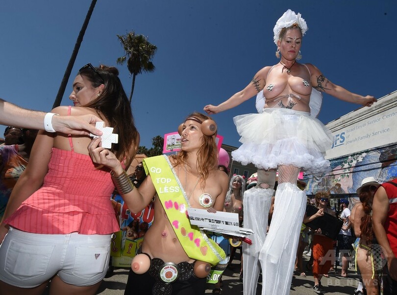 米カリフォルニア州ベニス・ビーチで、女性が公共の場で上半身裸になる権利を求める「ゴートップレスデー」のパレードに参加する人々(2015年8月23日撮影)。(c)AFP/MARK RALSTON