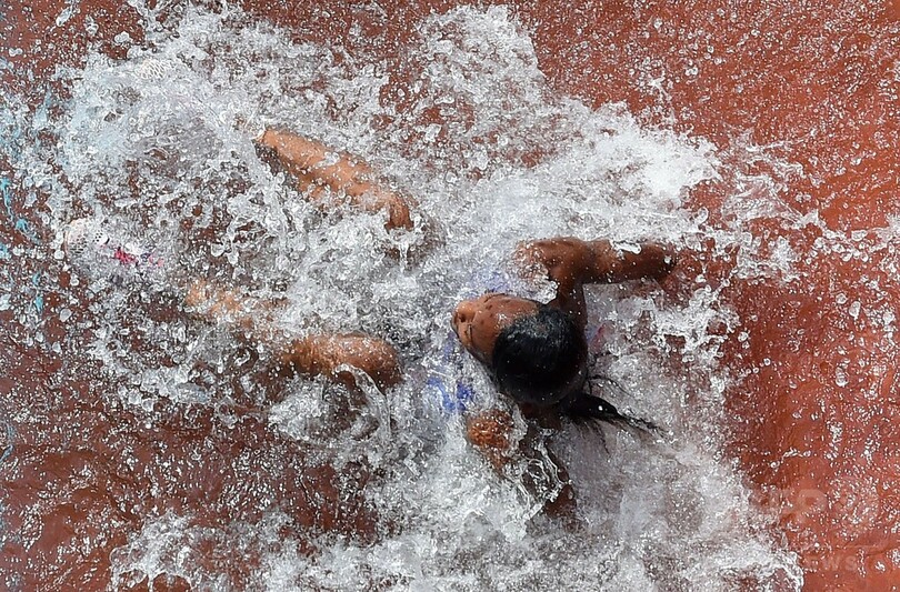 【8月24日 AFP】24日に行われた第15回世界陸上北京大会(15th IAAF World Championships in Athletics Beijing)の女子3000メートル障害予選で、水濠(すいごう)で転倒するロランダ・ベル(Rolanda Bell、パナマ)。(c)AFP