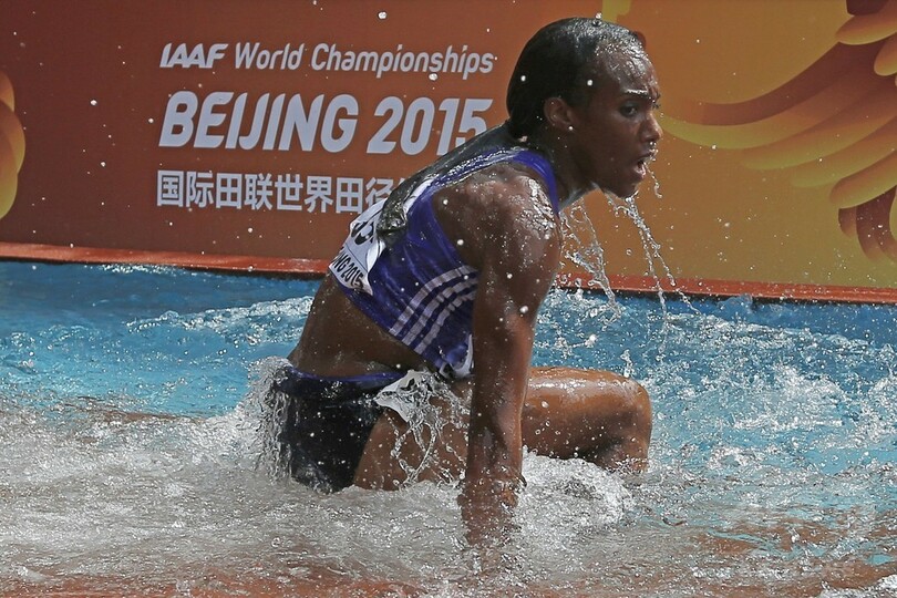 【8月24日 AFP】24日に行われた第15回世界陸上北京大会(15th IAAF World Championships in Athletics Beijing)の女子3000メートル障害予選で、水濠(すいごう)で転倒するロランダ・ベル(Rolanda Bell、パナマ)。(c)AFP