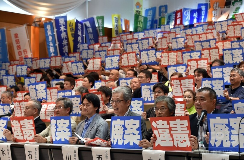 会員数約3万6000人の日弁連は、東京・霞が関の弁護士会館で記者会見を開いて法案への反対を表明した後、日比谷で集会を開催。法曹関係者のほか学者や学生、市民ら数千人が「違憲」「廃案」のプラカードを掲げ、法案の廃案を訴えた。(c)AFP