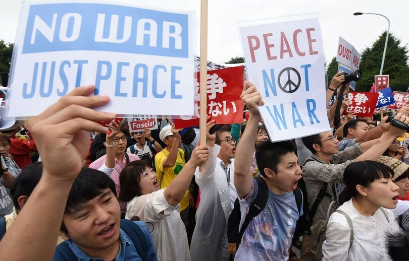 【8月30日 AFP】都内の国会周辺で30日、安倍晋三(Shinzo Abe)首相が成立を目指す安全保障関連法案に抗議するデモが行われ、数万人が参加した。与党自民党が同法案の9月末までの成立を目指す中、「反戦」「戦争ではなく平和を」「ストップ、安保法案」などと書かれたプラカードを持つ人々が国会前で抗議のスローガンを叫んだ。