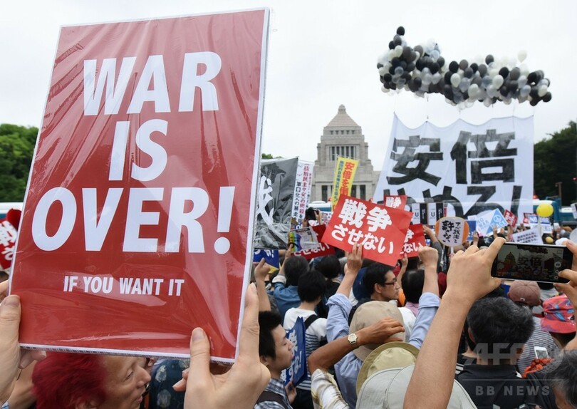 【8月30日 AFP】都内の国会周辺で30日、安倍晋三(Shinzo Abe)首相が成立を目指す安全保障関連法案に抗議するデモが行われ、数万人が参加した。与党自民党が同法案の9月末までの成立を目指す中、「反戦」「戦争ではなく平和を」「ストップ、安保法案」などと書かれたプラカードを持つ人々が国会前で抗議のスローガンを叫んだ。