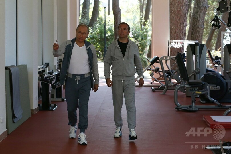 【8月31日 AFP】ロシア・ソチ(Sochi)の別荘「ボチャロフ川(Bocharov Ruchei)」で過ごす、同国のウラジーミル・プーチン(Vladimir Putin)大統領とドミトリー・メドベージェフ(Dmitry Medvedev)首相。自ら朝食を作り、ジムでトレーニングを行った。(c)AFP
