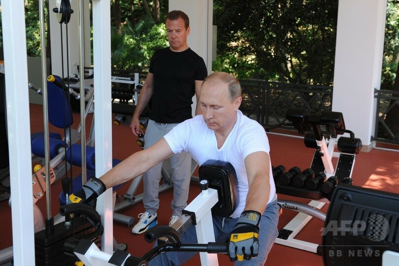 【8月31日 AFP】ロシア・ソチ(Sochi)の別荘「ボチャロフ川(Bocharov Ruchei)」で過ごす、同国のウラジーミル・プーチン(Vladimir Putin)大統領とドミトリー・メドベージェフ(Dmitry Medvedev)首相。自ら朝食を作り、ジムでトレーニングを行った。(c)AFP