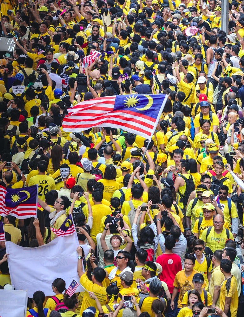 雨模様となった2日目のデモでは、クアラルンプール中心部が改革支持派のシンボルカラーの黄色で埋め尽くされた。