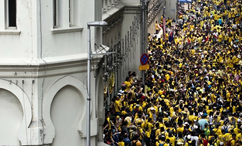 雨模様となった2日目のデモでは、クアラルンプール中心部が改革支持派のシンボルカラーの黄色で埋め尽くされた。