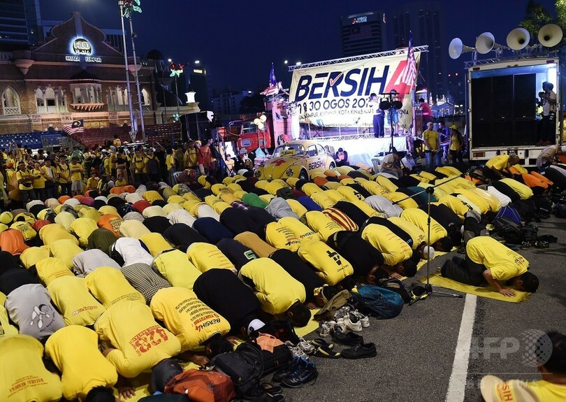 ナジブ首相は、個人口座に2013年以降およそ7億ドル(約850億円)の送金を受けていた疑惑を米紙ウォールストリート・ジャーナル(Wall Street Journal、WSJ)が先月報じて以来、厳しい退陣圧力にさらされている。首相は当初疑惑を否定していたが、その後、閣僚が中東からの「政治献金」だと認めていた。(c)AFP