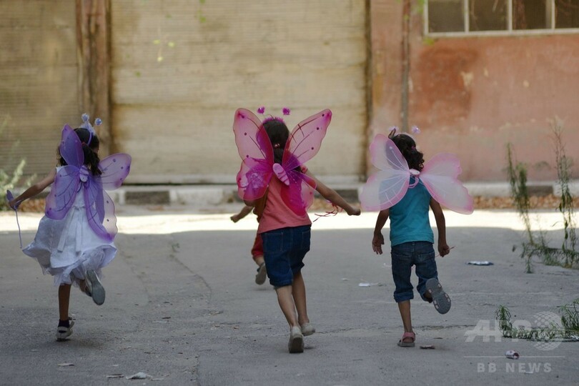 【9月3日 AFP】シリアの首都ダマスカス(Damascus)南部のヤルムーク(Yarmuk)にあるパレスチナ難民キャンプで、チョウの衣装を着て遊ぶパレスチナ人の少女たち。