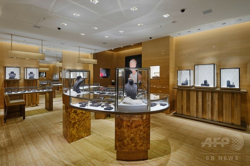 ストアデザインは、パリ ヴァンドームのサロンも手がける建築家ピーター・マリーノ(Peter Marino)氏。光を取り込めるようにデザインされ、ゴールドに輝くモノグラム・モチーフが店内をより華やかに彩る。ファハド・モシリ氏によるアート作品「Bride 3」のタペストリーや、希少素材を用いた流線形のフェミニンなディスプレイが配置され、製品のストーリーが際立つようシンプルかつ洗練した空間に仕上がった。