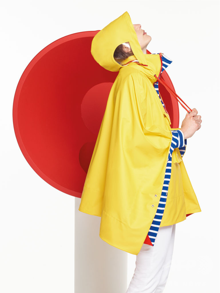 カステルバジャックの手によって生まれ変わったプチバトーのアイテムは、カラフルでインパクトのあるスタイルに仕上がった。クラシックなヨットパーカはポンチョに、そのフードは帽子に進化し、アイコニックなマリニエールは明るい黄色のパテントや赤いキャンバスのショルダーパッドによってポップになった。さらに、夢見る船乗りを描いたカラフルなプリントが、100%ピュアコットンのベビー用ボディや、キッズ、大人のTシャツ、スウェットシャツを陽気に彩っている。プチバトーの遊び心あふれる世界観に、カステルバジャックの詩的でポップなエッセンスが加わり、青、赤、黄色の鮮やかな色彩が華やかさとコントラストを与えるコレクションとなった。