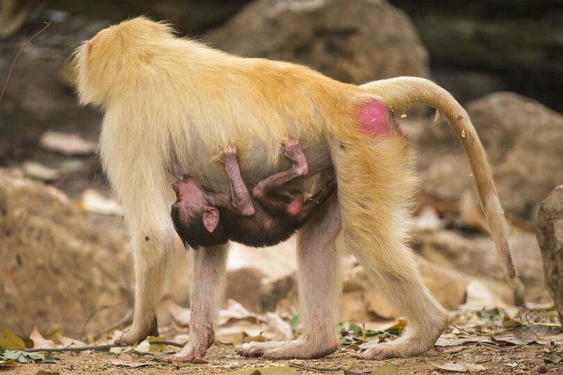 生後3週間の赤ちゃんヒヒ、いつもお母さんと一緒 テルアビブ