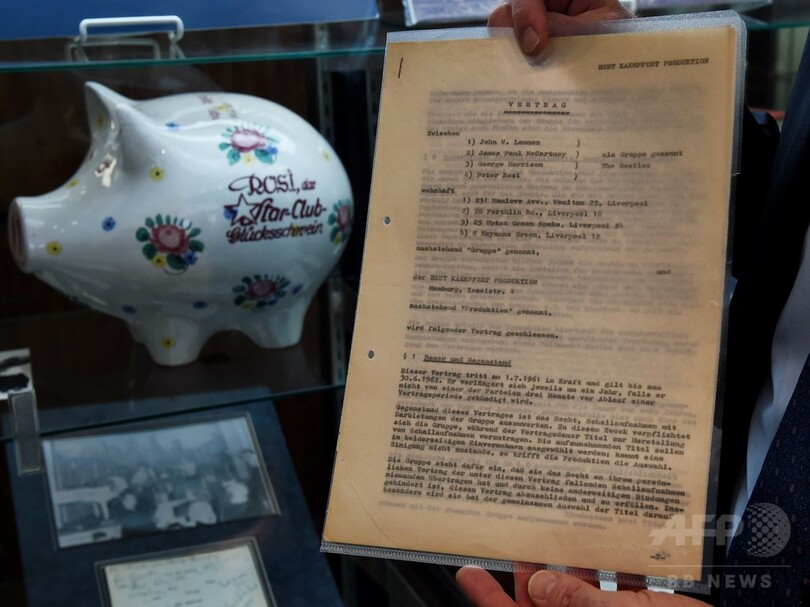 スニーカーやフィギュアなどのビートルズ・グッズに加えて、リンゴ・スター(Ringo Starr)が1960年に独ハンブルク(Hamburg)から祖母に送ったはがきや、メンバーたちが1961年に「マイ・ボニー(My Bonnie)」のセッションを行った際、初めてサインしたレコーディング契約書なども含まれる。同契約書の推定落札価格は15万ドル(約1800万円)。(c)AFP