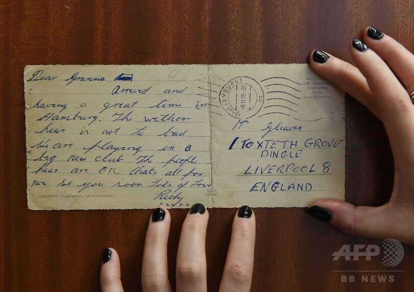 スニーカーやフィギュアなどのビートルズ・グッズに加えて、リンゴ・スター(Ringo Starr)が1960年に独ハンブルク(Hamburg)から祖母に送ったはがきや、メンバーたちが1961年に「マイ・ボニー(My Bonnie)」のセッションを行った際、初めてサインしたレコーディング契約書なども含まれる。同契約書の推定落札価格は15万ドル(約1800万円)。(c)AFP