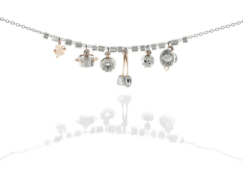 この「ラッキーシェフ」は、食をテーマに掲げるミラノ万博にインスパイアし、今年5月にローンチしたコレクション。ポメラートの金細工師の手で細部まで丁寧に作られたシルバーとローズゴールドのチャームは、キャセロール、パスタストレーナー、レードル、ゼリー型、ドーナツ型の、かわいらしいキッチンアイテムたちだ。