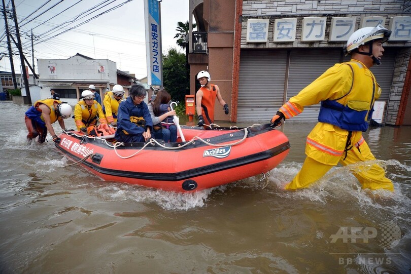 【9月10日 AFP】豪雨に見舞われた関東北部で10日、河川が氾濫して洪水が発生し、住宅や車が流されたり損傷を受けたりする被害が広がった。避難を命じられた住民は数万人に上り、消防隊員にゴムボートで救出される人もいた。
