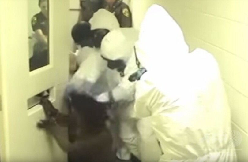 映像には、マッケナ容疑者が拘禁施設の独房内で排便したとしてバイオハザード用の防護服を着用した警察官たちが、抵抗する同容疑者を別の施設に移送しようする様子が捉えられている。