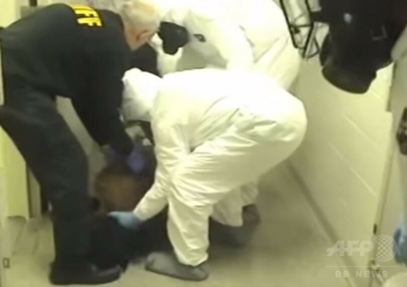 映像には、マッケナ容疑者が拘禁施設の独房内で排便したとしてバイオハザード用の防護服を着用した警察官たちが、抵抗する同容疑者を別の施設に移送しようする様子が捉えられている。