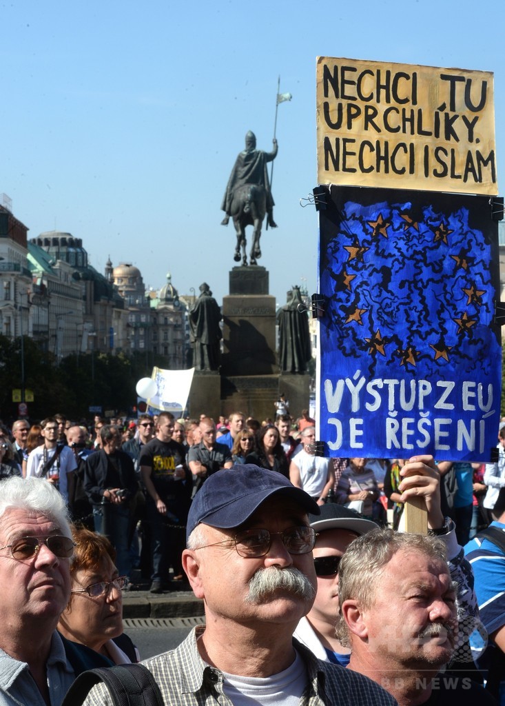 チェコ・プラハ(Prague)やスロバキア・ブラチスラバ(Bratislava)でも数百人規模のデモがあり、「歓迎しない、帰れ」と書かれた横断幕などが掲げられた。(c)AFP/Robin Millard with Eric Randolph on the Hungary/Serbia border