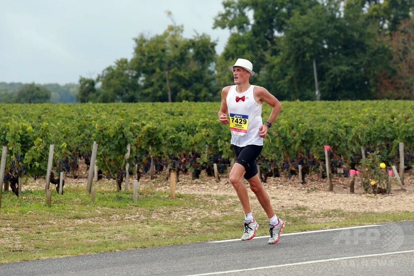 仏シャトー巡りマラソン、給水所ではワインを提供