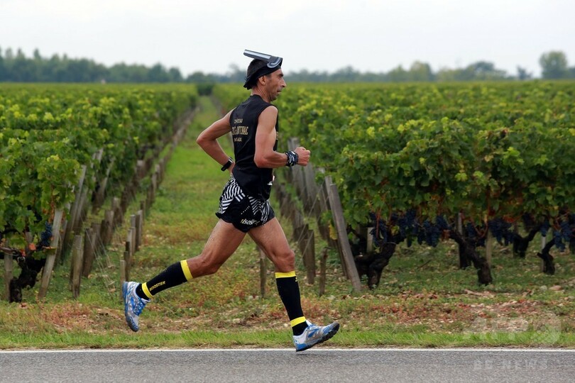 【9月14日 AFP】フランス南西部ボルドー(Bordeaux)近郊のメドック(Medoc)地方で12日、ブドウ畑の中を走り抜け、いつくものシャトー(ワイン醸造所)を巡る恒例の「メドックマラソン(Le Marathon du Medoc)」が行われた。今年で31回目を迎えたこの全長42.2キロマラソン大会で、参加者たちは地元のワイン醸造所30軒以上に立ち寄った。(c)AFP