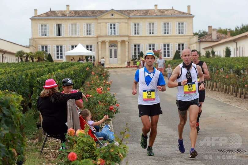 【9月14日 AFP】フランス南西部ボルドー(Bordeaux)近郊のメドック(Medoc)地方で12日、ブドウ畑の中を走り抜け、いつくものシャトー(ワイン醸造所)を巡る恒例の「メドックマラソン(Le Marathon du Medoc)」が行われた。今年で31回目を迎えたこの全長42.2キロマラソン大会で、参加者たちは地元のワイン醸造所30軒以上に立ち寄った。(c)AFP