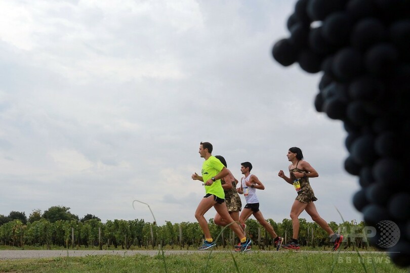 【9月14日 AFP】フランス南西部ボルドー(Bordeaux)近郊のメドック(Medoc)地方で12日、ブドウ畑の中を走り抜け、いつくものシャトー(ワイン醸造所)を巡る恒例の「メドックマラソン(Le Marathon du Medoc)」が行われた。今年で31回目を迎えたこの全長42.2キロマラソン大会で、参加者たちは地元のワイン醸造所30軒以上に立ち寄った。(c)AFP