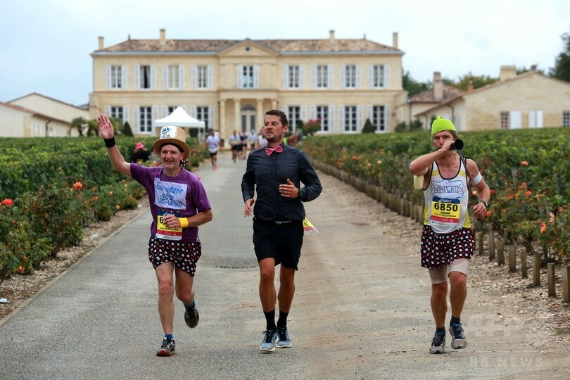 【9月14日 AFP】フランス南西部ボルドー(Bordeaux)近郊のメドック(Medoc)地方で12日、ブドウ畑の中を走り抜け、いつくものシャトー(ワイン醸造所)を巡る恒例の「メドックマラソン(Le Marathon du Medoc)」が行われた。今年で31回目を迎えたこの全長42.2キロマラソン大会で、参加者たちは地元のワイン醸造所30軒以上に立ち寄った。(c)AFP