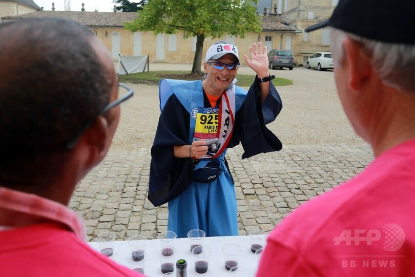 仏シャトー巡りマラソン、給水所ではワインを提供